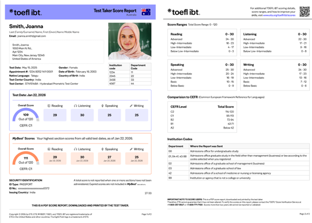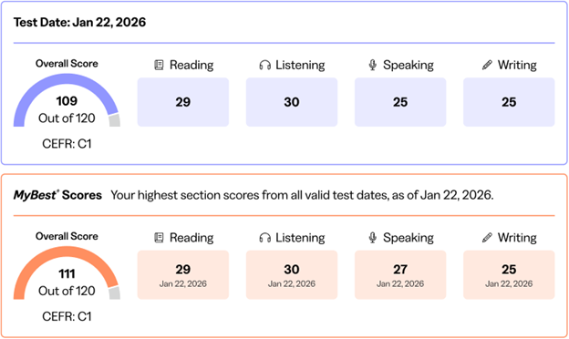 MyBest scores combine your highest section scores from all valid TOEFL iBT tests taken in the past 2 years. This can help you meet score requirements with fewer test attempts.